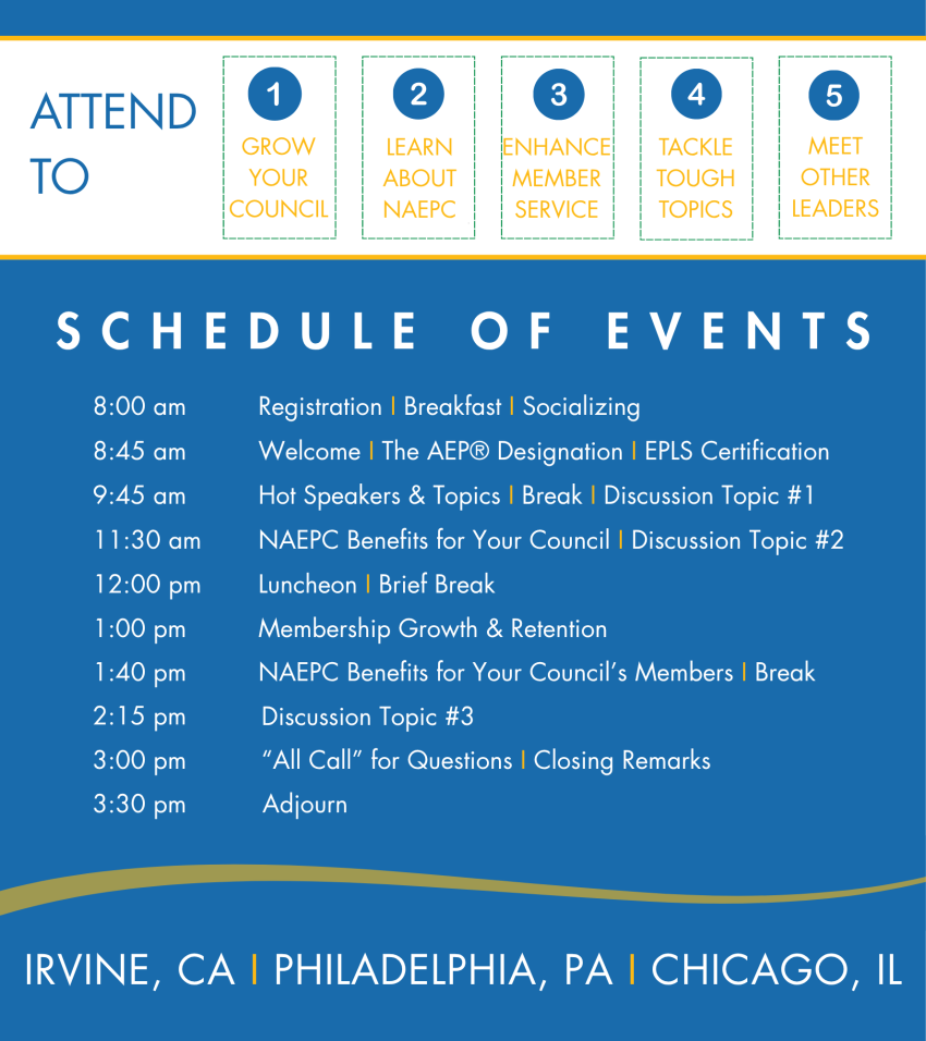 The program will include an overview of NAEPC programs and services, with a primary emphasis on interactive sharing sessions centered on the topics you have told us are most important to your council like membership growth and retention, social media and AI, creating a welcoming member experience, sponsorship development, operational challenges, leading effective meetings, and crafting compelling event promotions. Discussion topics will be planned using input provided by attendees at registration.